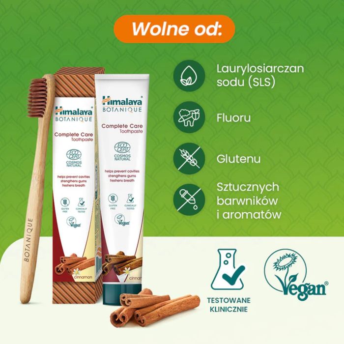 Pasta do zębów Himalaya Botanique Complete Care z cynamonem to starannie skomponowana formuła o działaniu wielowymiarowym. Bogactwo naturalnych składników, takich jak neem i owoc granatu, w połączeniu z intensywnym aromatem cynamonu, zapewnia kompleksową pielęgnację jamy ustnej.