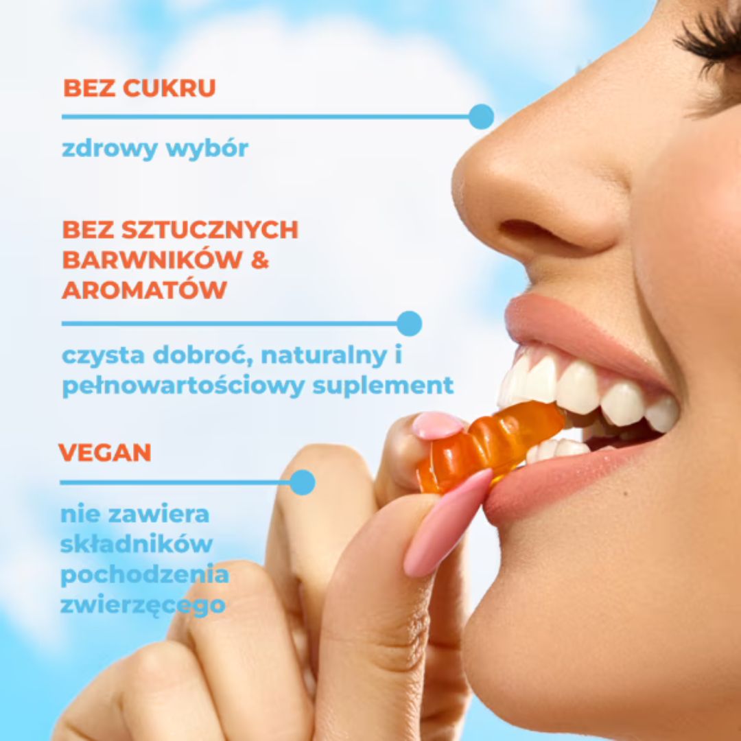 • Bez sztucznych kolorów i aromatów - żelki nie zawierają sztucznych barwników ani aromatów, oferując naturalną i zdrową suplementację.