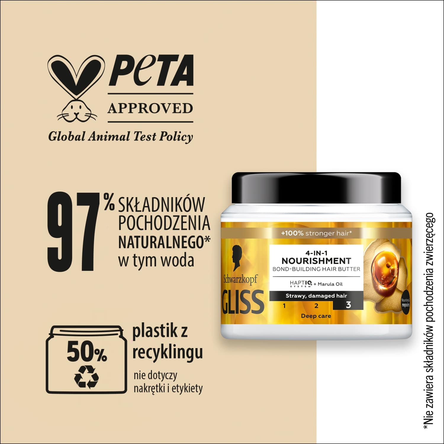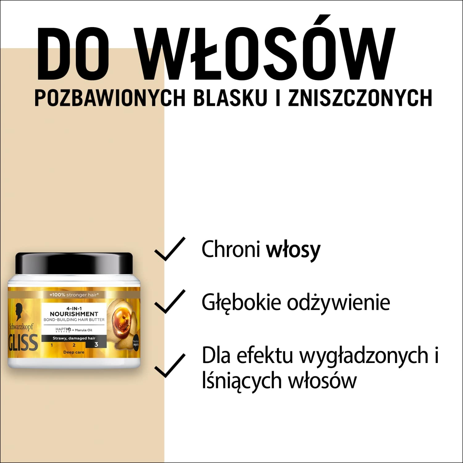 Gliss 4 w 1 odżywcze masło tworzące wiązania wewnątrz włosów z systemem Haptiq i olejem Marula do włosów przesuszonych i zniszczonych.