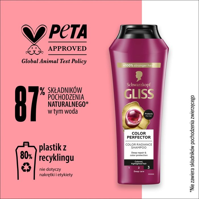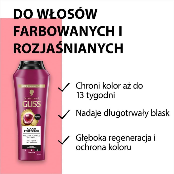 Włosy farbowane, rozjaśniane lub z pasemkami? Szampon do włosów Schwarzkopf Gliss Colour Perfector zadba o Twoje włosy i kolor, tak by nie blaknął przez częste mycie. Opracowana specjalnie z myślą o potrzebach włosów farbowanych, formuła Colour Perfector wzbogacona została o kompleks kwasu hialuronowego i ekstrakt z żurawiny.