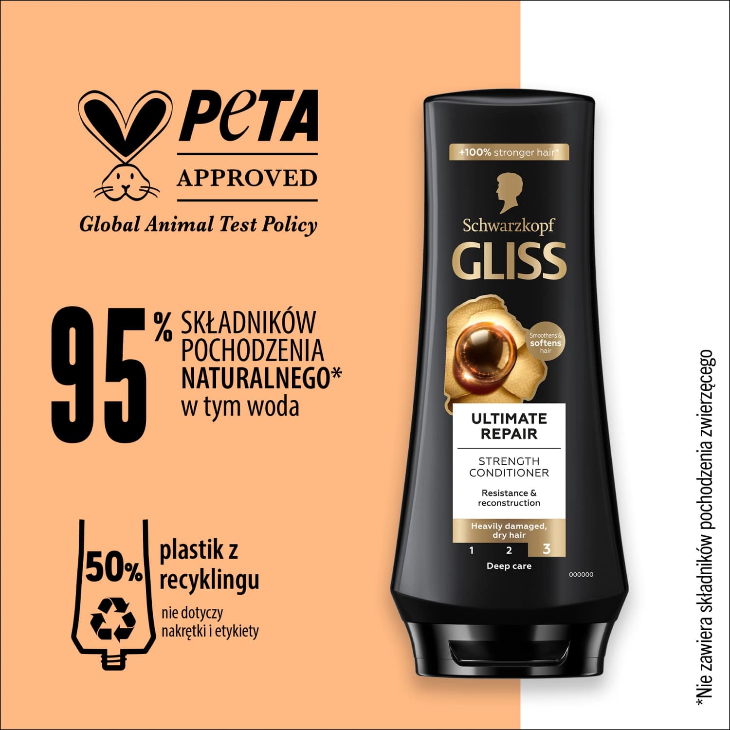 Formuły wszystkich produktów Schwarzkopf Gliss, opracowane na bazie zaawansowanych składników aktywnych oraz skarbów natury i dopasowane do konkretnych potrzeb włosów, zapewniają włosom regenerację oraz widocznie poprawiają ich kondycję. * Stosowane wraz z szamponem Ultimate Repair.